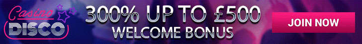 VELKOMSTBONUS Tilmeld dig, indbetal og nyd CasinoDiscos imponerende første indbetaling bonus på 300% op til 500kr. Når du har indbetalt, får du fire gange din første indbetaling i din spiller balance. Få bekendtskab med deres spil og vælg dine favoritter for at hjælpe dig med at vinde store præmier. |