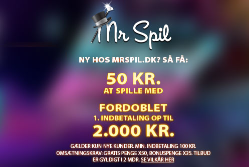 Få 50 kr når du tilmelder dig og en 100% bonus på 2.000 kr på 1. depositum hos MrSpil!