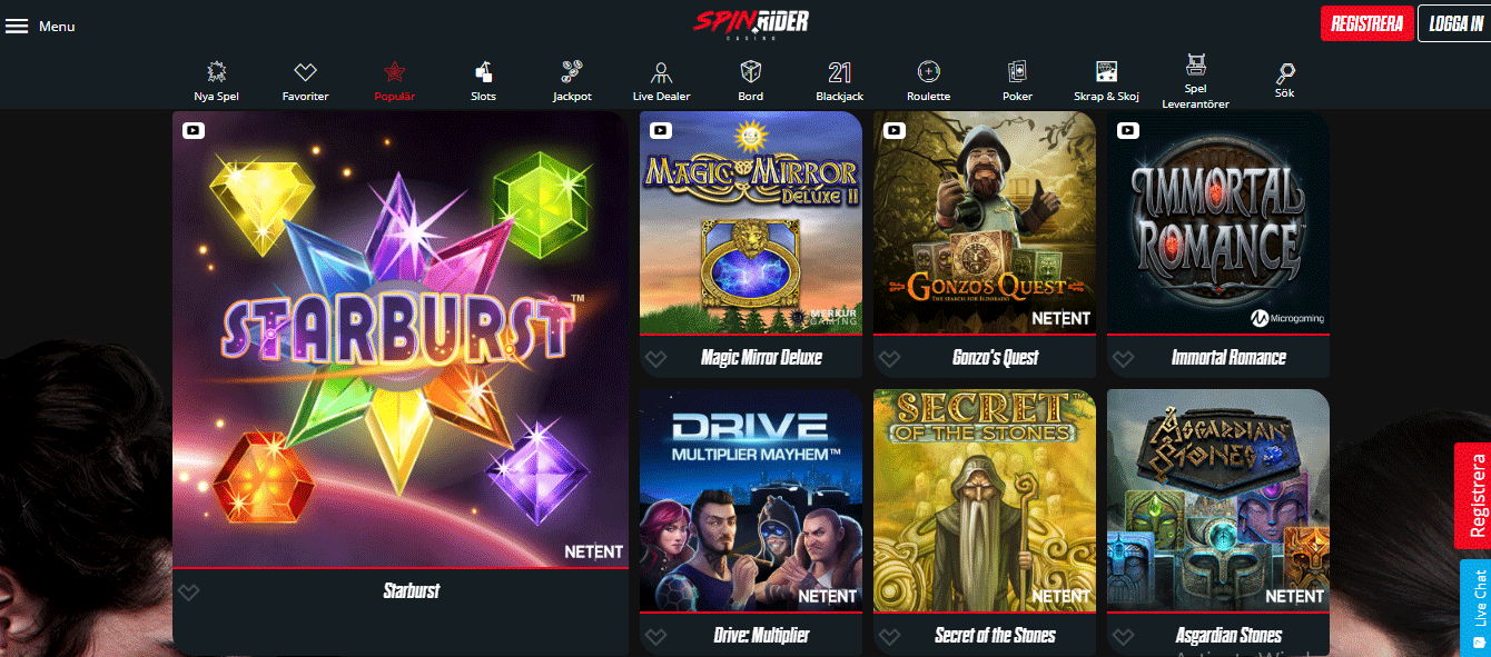 SpinRider Casino er et online casino, hvor medlemmer har adgang til en række spil og spilleautomater. Medlemmer kan nyde titler fra forskellige software udbydere som NetEnt, Microgaming, Nyx Interactive, Blueprint Gaming, Merkur Gaming, Elk Studios og mange andre. Spil kan spilles direkte via en webbrowser, eller medlemmer kan bruge deres mobile casino. |