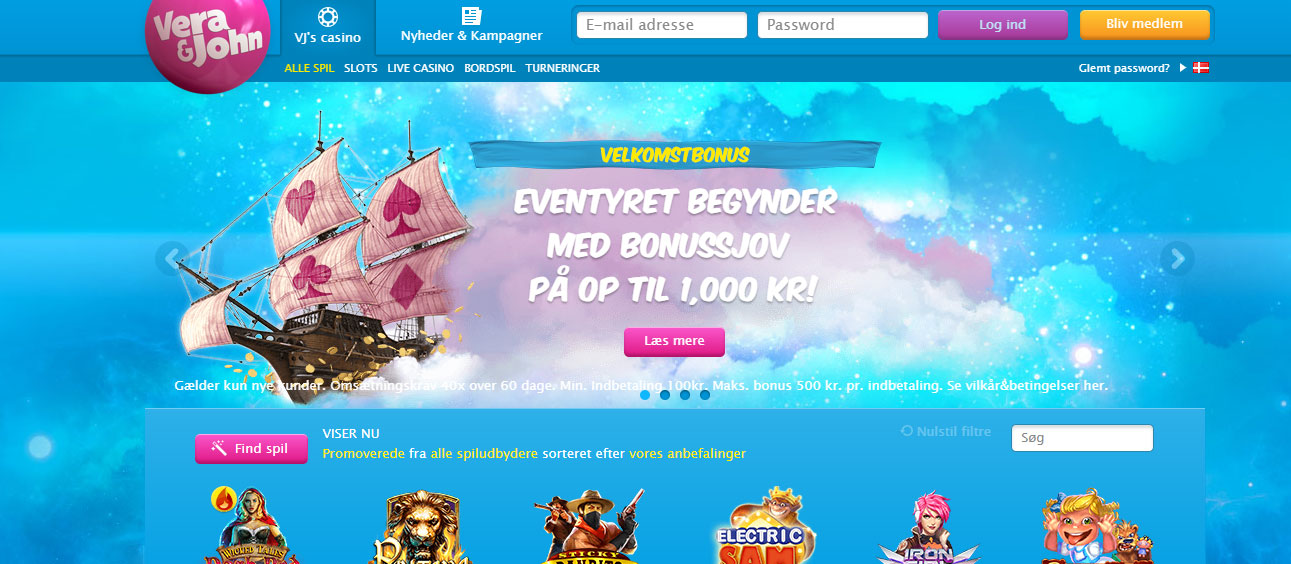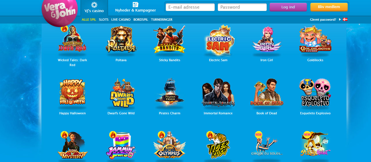 Vera & John er et velkendt casino i Danmark, de ses ofte på tv-reklamer, og kun navnet gør dig sikker på at besøge casinoet. Men den skinny bryder sig ikke, Vera & John er en af de mest spillede casinoer og er også kendt i mange andre lande uden for Danmark. På Vera & John finder du alle de casinospil, du måtte ønske, lige fra slots, automater, kortspil til alle de klassiske casinospil.